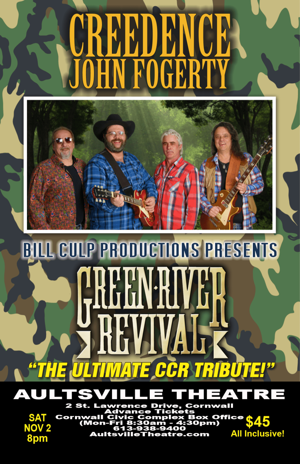 Calling all fans of Creedence Clearwater Revival! Don’t miss “Green River Revival”, the worlds’ #1 international tribute to the legendary CCR. “Green River Revival” presents the music of CCR with a historical storyline that incorporates several costume changes including the “chain gang prison uniforms” right out of the song “Midnight Special”, those plaid flannel shirts made famous by CCR in the 60’s, and of course, army fatigues depicting the era of John Fogerty’s Vietnam protest songs. This talented troupe of world-class musicians truly captures the passion and soul of John Fogerty and CCR, performing timeless hits including “Proud Mary”, “Lodi”, “Bad Moon Rising”, “Have You Ever Seen The Rain”, “Fortunate Son”, “Up Around The Bend” and “Travellin’ Band” amongst the many audience favourites.