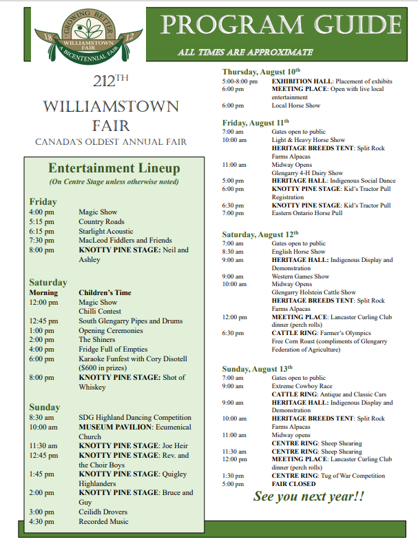 The Williamstown Fairgrounds is a beautiful site featuring majestic pine trees and beautiful heritage style buildings. Set in the center of the historic Village of Williamstown, it provides the ideal setting for “Canada’s Oldest Annual Fair”.