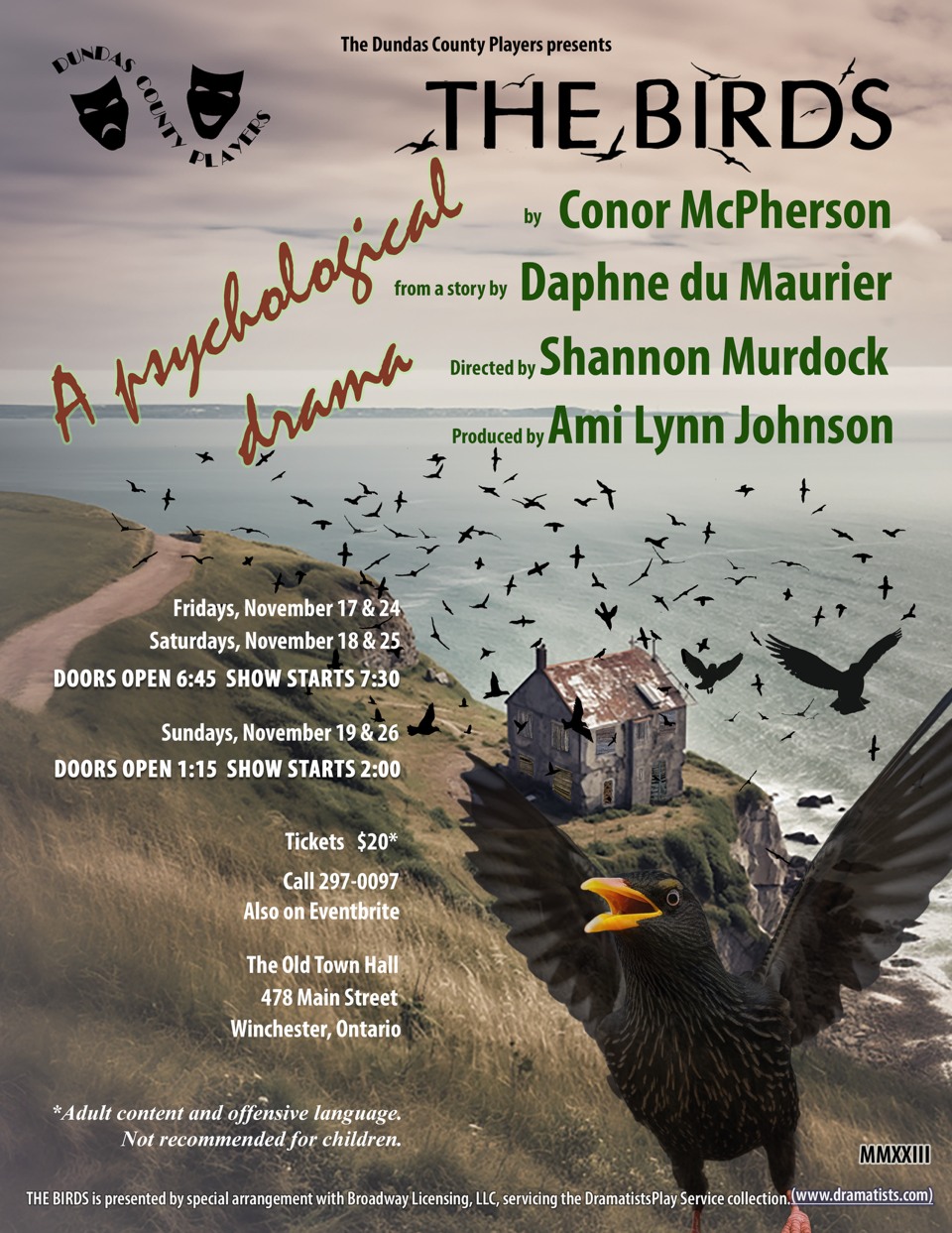 The Dundas County Players Theatrical Society is excited to announce the upcoming fall production “The Birds” written by Irish playwright Conor McPherson. This psychological thriller was adapted from Daphne Du Maurier’s short story, which was also the basis of the classic Alfred Hitchcock film.