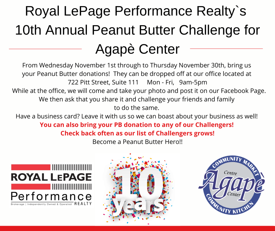 10th Annual Peanut Butter Challenge for Agape Centre Where 722 Pitt St - Suite 111, Cornwall, ON Map When Nov 01/23 09:00 AM - Nov 30/23 05:00 PM Age All