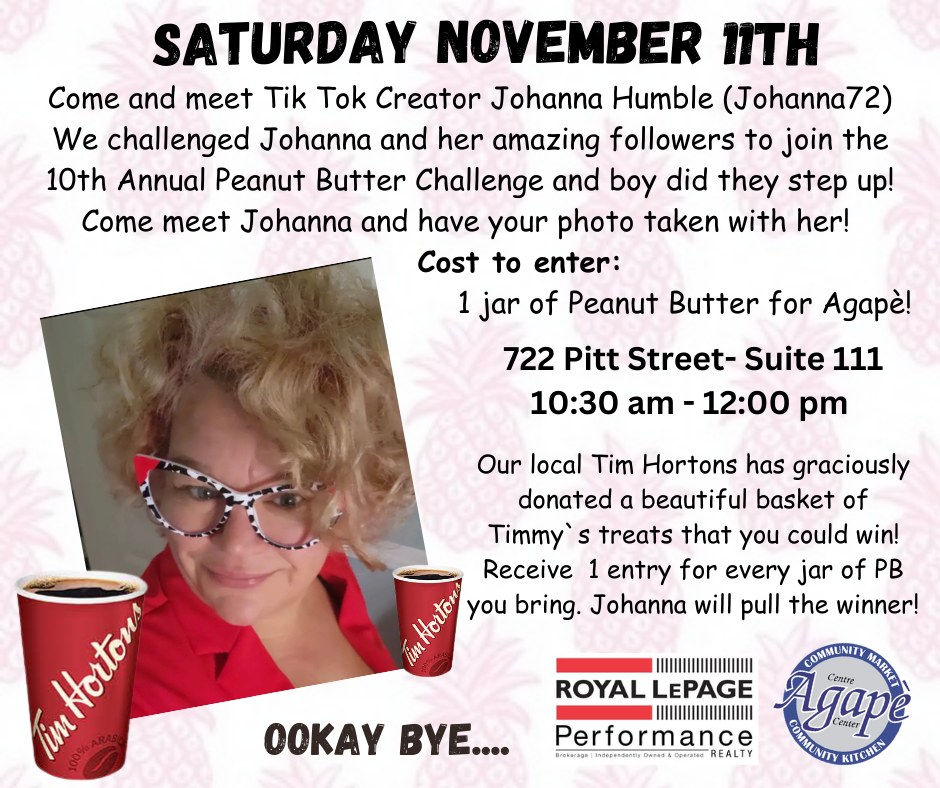 10th Annual PB Challenge for Agape Centre: Johanna Humble Where 722 Pitt St - Suite 111, Cornwall, ON Map When Nov 11/23 10:30 AM - Nov 11/23 12:00 PM Age All