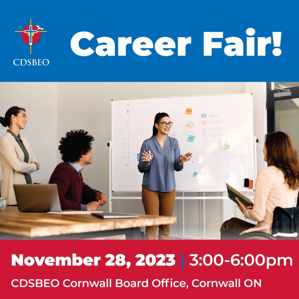 Join us for the CDSBEO Career Fair on November 28, in Cornwall! Meet the team and explore various opportunities currently available at the CDSBEO including openings for educational assistants, custodians, teachers, principals/vice-principals, early childhood educators, secretaries, maintenance professionals, and more!