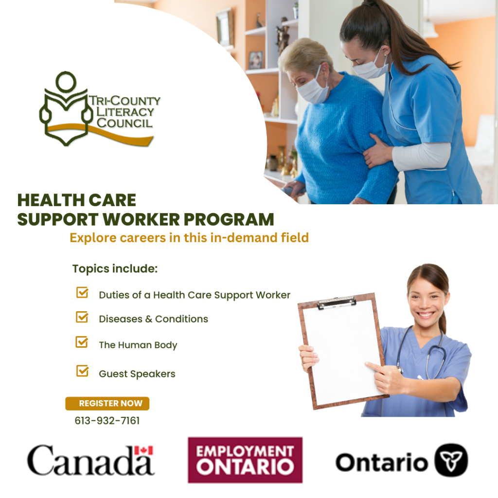 Do you like to care for others? Do you have an interest in working in the health care field? Tri-County Literacy Council, 101 2nd Street West, Cornwall, ON is pleased to offer free 6-week training: Health Care Support Worker starting April 8, 2024. In Canada, the population is aging and the need for more support for ailing and disabled individuals is increasing. The health care support worker profession is an emerging field of employment. Assisting with bedside and personal care to clients, planning and preparing meals, helping with light housework, and spending time talking to clients are typical duties of a health care support worker. Participants will have the opportunity to learn about: