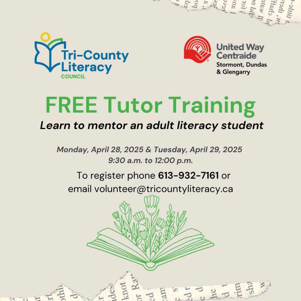 The Tri-County Literacy is pleased to offer a FREE 2-Day Tutor Training on April 28, 2025 & April 29, 2025, 9:30 a.m. to 12:00 p.m. Learn to mentor an adult literacy student. To register, call 613-932-7161 or email: volunteer@tricountyliteracy.ca .