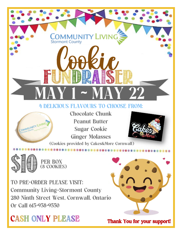 Community Living Stormont County is having a Cookie Fundraiser to celebrate Community Living Month! There are 4 delicious flavours to choose from. (chocolate chip, peanut butter, sugar cookie and ginger molasses. Cookies are provided by Cakes and More Cornwall.