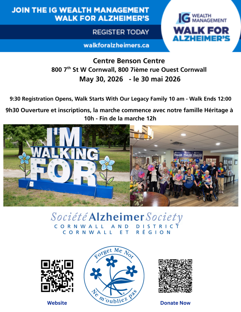 Walk for Alzheimer’s Where Benson Centre, 800 7th St W, Cornwall, Ontario Map When May 30/26 09:30 AM - May 30/26 12:00 PM Age All Website https://alz.to/support-the-society/walk/